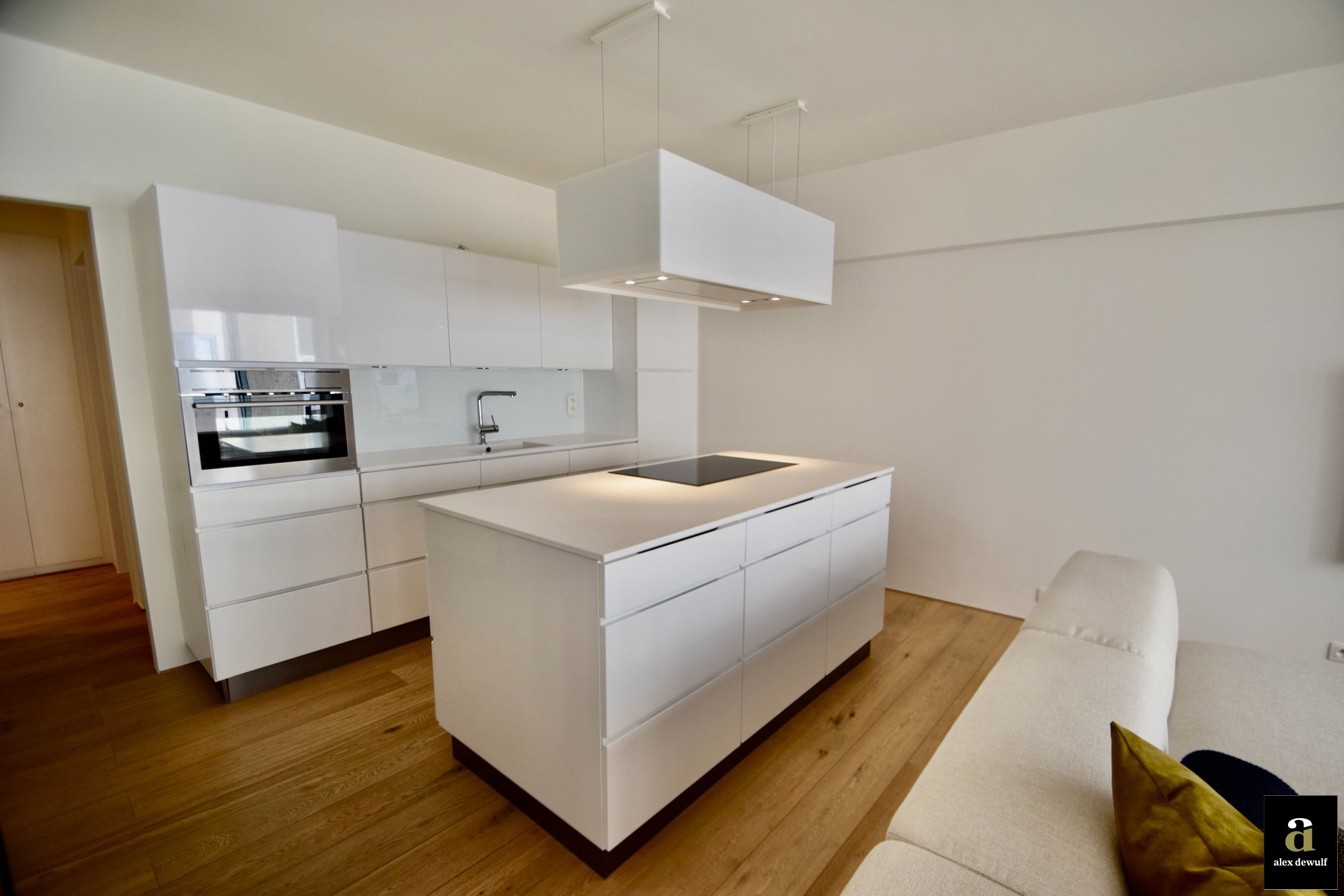 This modern apartment with lateral sea views is ideally located, close to the shops on Kustlaan and just a few steps from the beach and the sea. Upon entering, you are welcomed into a spacious hall with a wardrobe and a separate guest toilet. The open kitchen is fully equipped with modern appliances and seamlessly connects to the bright living area. This spacious living room, 6 meters wide, opens onto a cozy balcony and offers space for both a lounge and a dining area. The apartment features two double bedrooms, each with built-in wardrobes and their own en-suite bathroom or shower room. Additionally, there are practical amenities, including a bike storage area on the ground floor and a private cellar in the residence. EPC: