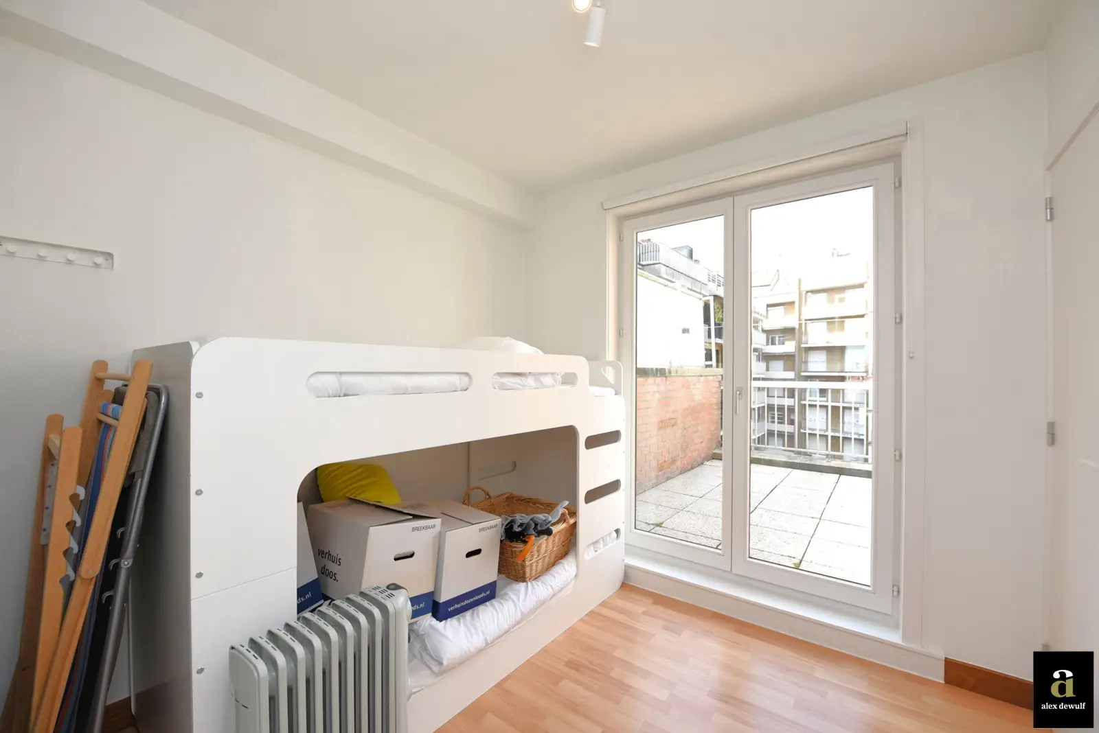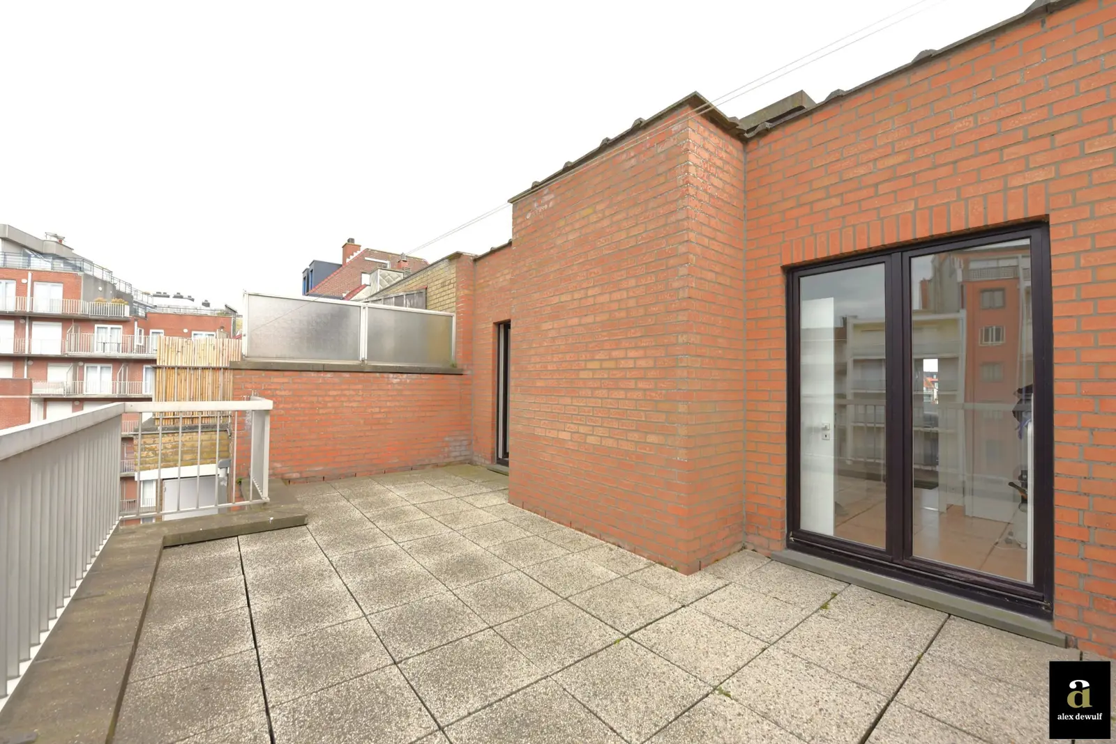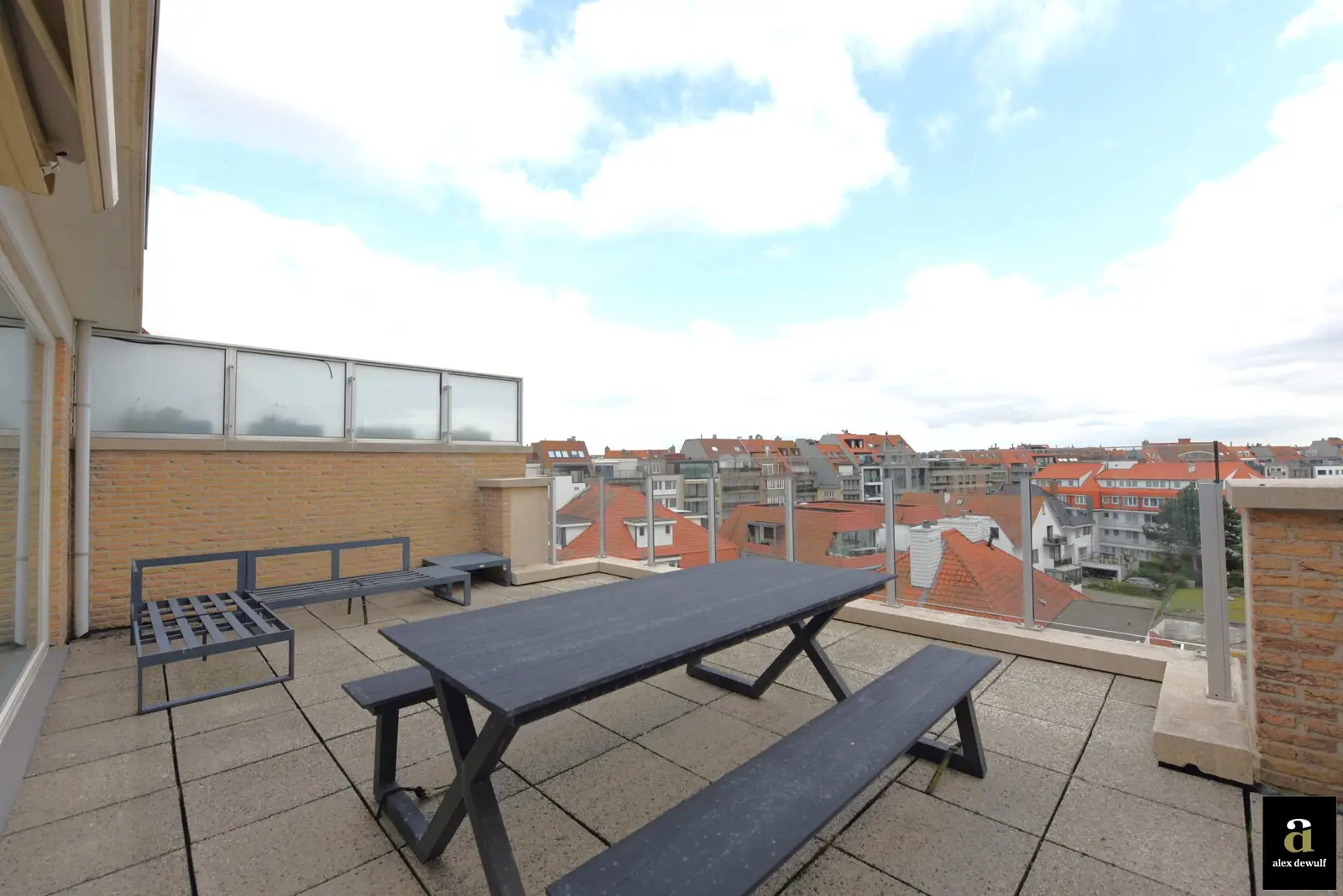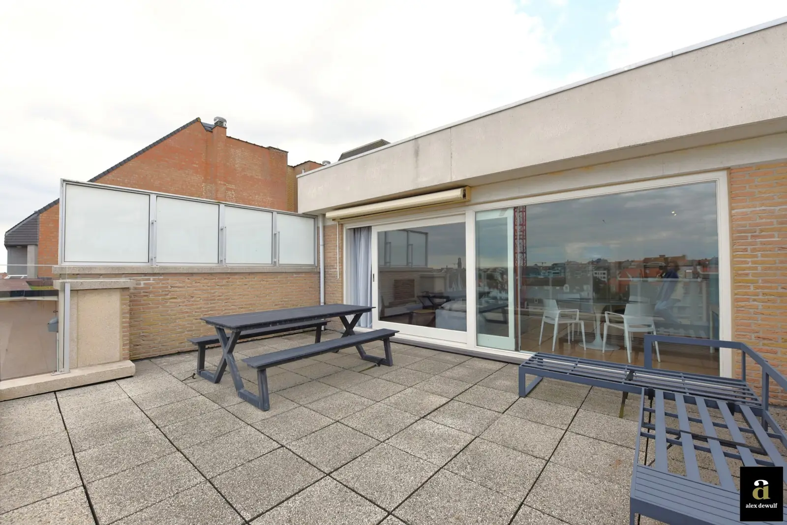 Stylishly furnished 2-bedroom apartment on Jozef Nellenslaan, just a few minutes' walk from the beach. It features two spacious bedrooms, a modern bathroom with a bathtub, and an open kitchen that seamlessly connects to the bright living area. Two large rooftop terraces offer space to relax outdoors. Additionally, the apartment comes with a private garage. Condo fees are included.