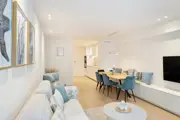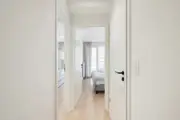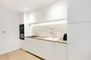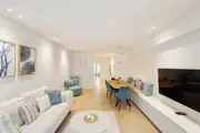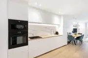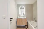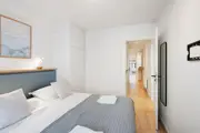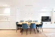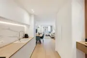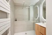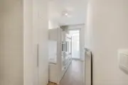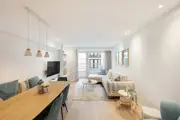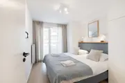 Beautifully renovated holiday apartment with 2 bedrooms, centrally located in the Zoute. A prime location in Knokke, between Driehoeksplein and the Zeedijk. This location offers the convenience of nearby commercial shops and restaurants within walking distance. Layout: Entrance hall with cloakroom, guest toilet, and a pleasant living space consisting of a semi-open kitchen (equipped with modern appliances), a lounge, and a dining area. The master bedroom features built-in wardrobes and an en-suite shower room. The second bedroom has an adjoining bathroom with a bathtub. At the rear, you can enjoy a west-facing terrace. The apartment also includes electric shutters, a private basement storage unit, and a bicycle storage area in the building.