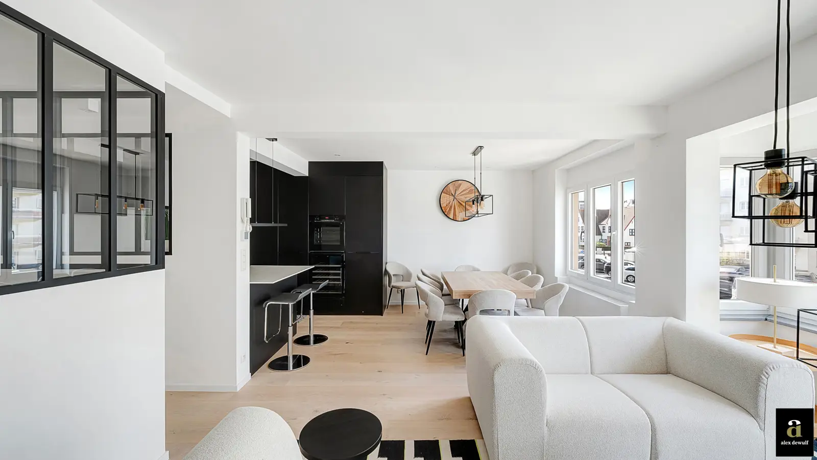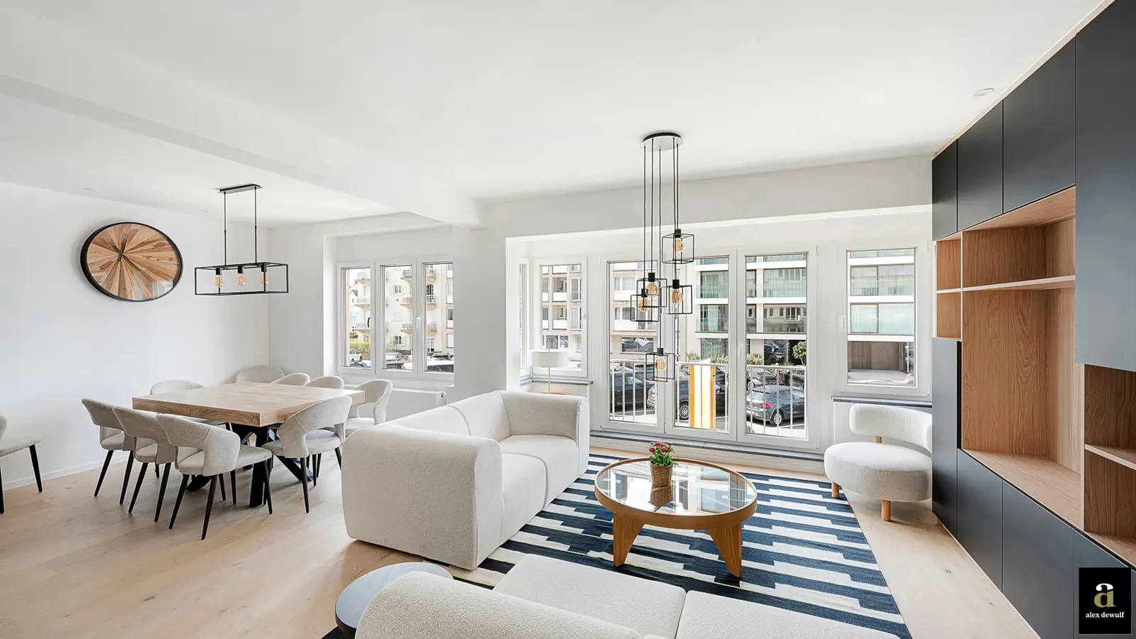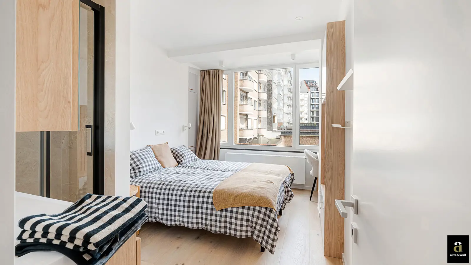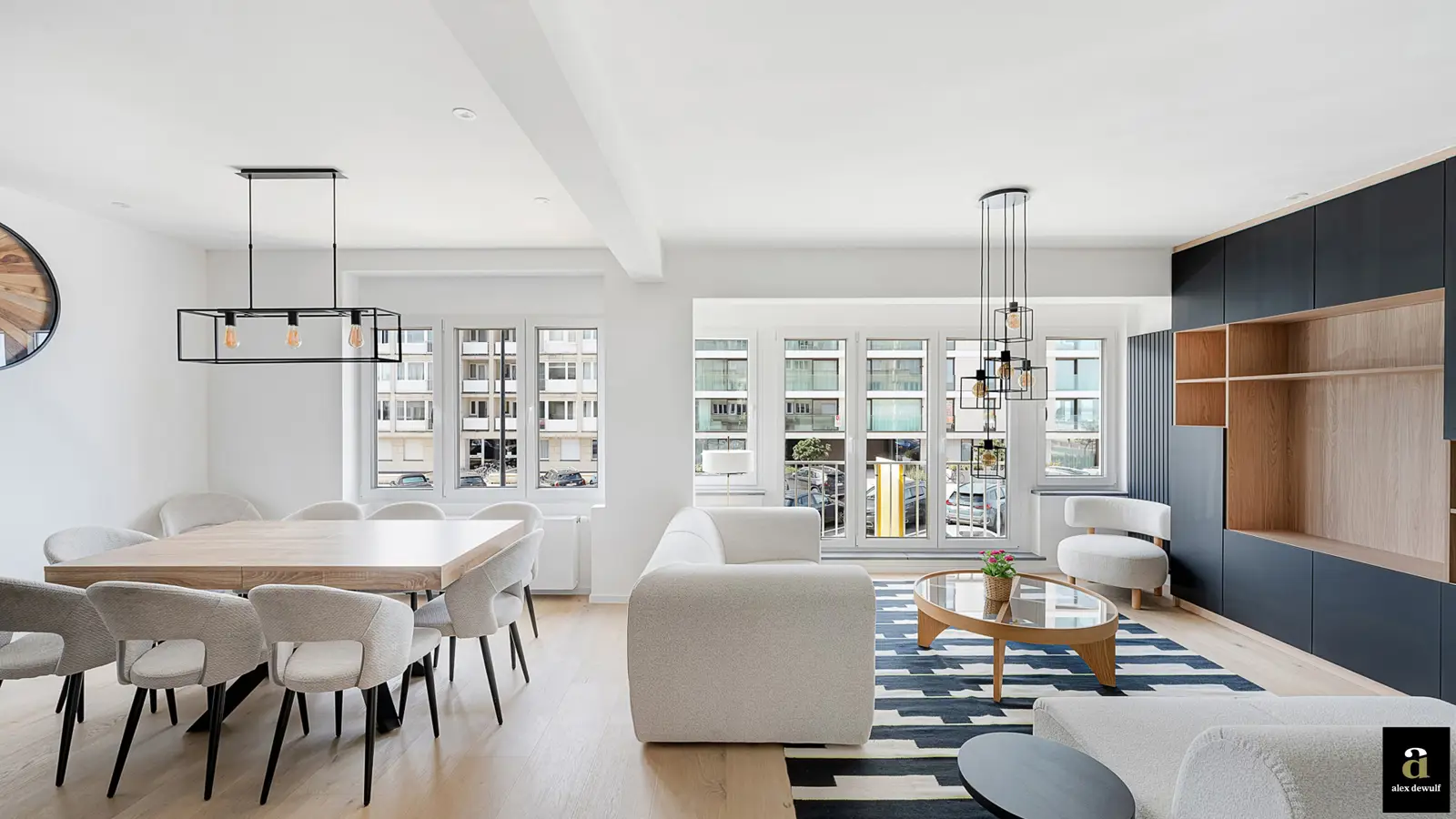 Stylishly renovated apartment with beautiful sea views at Albert Beach, within walking distance of the vibrant centre of Knokke. Entrance hall with cloakroom and guest toilet. Spacious and bright living and dining area overlooking the sea. Open, modern kitchen fitted with high-quality appliances. The apartment features two generous bedrooms, each with its own en-suite shower room or bathroom. Both bedrooms are equipped with built-in wardrobes and a desk. A third room can be used as an additional bedroom, home office or reading area and also has a shower room. Communal bicycle storage and private cellar included. Furniture is included in the price.