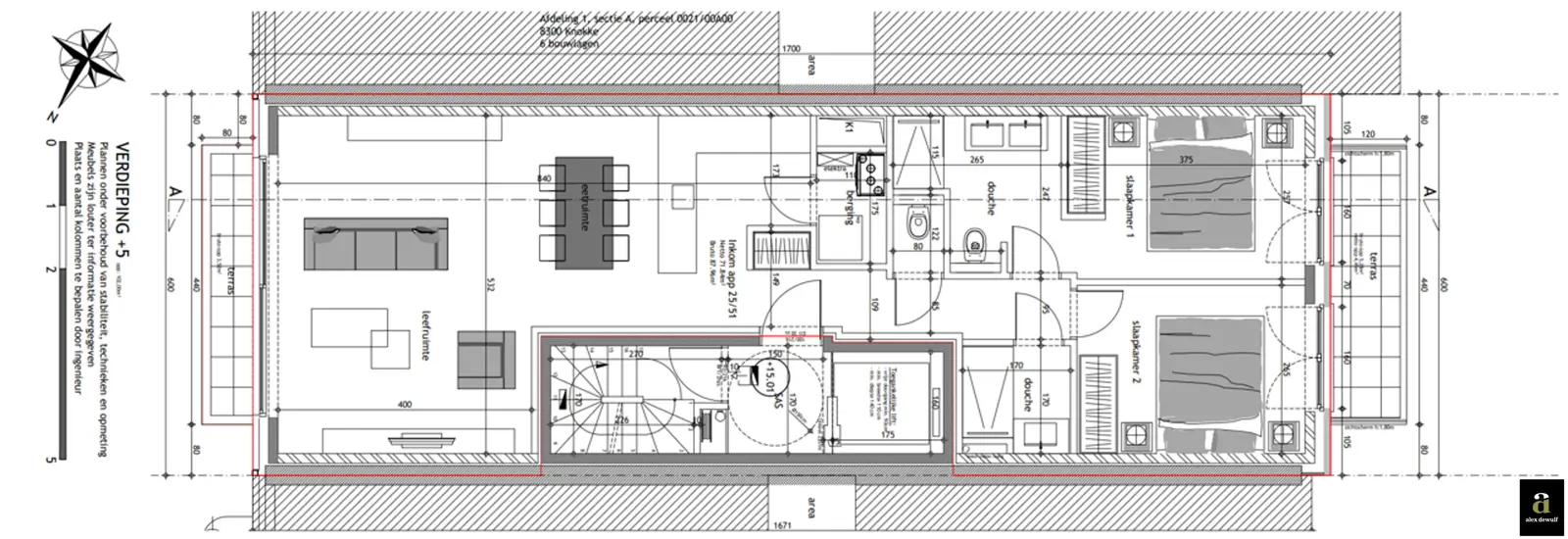 In een rustige zijstraat van het Albertstrand, op amper 50 m van zee en strand, bevindt zich dit elegant afgewerkt appartement in de nieuwbouwresidentie Des Étoiles. Een ligging met blijvende meerwaarde dankzij de heraanleg van de Casinowijk en het nieuwe landschapspark dat de buurt nog verder opwaardeert.Het appartement op de vijfde verdieping omvat een inkomhal met vestiaire en gastentoilet, een lichtrijke leefruimte met zijdelings zeezicht en toegang tot het zonnige terras vooraan. De open, volledig ingerichte keuken sluit aan op een praktische berging met aansluiting voor wasmachine.Achteraan bevinden zich twee volwaardige slaapkamers, elk geschikt voor een dubbel bed. Eén slaapkamer heeft een eigen douchekamer met toilet; de tweede douchekamer is bereikbaar via de nachthal. Beide kamers geven uit op het rustige achterterras. Beide terrassen zijn afgewerkt met houten beplanking; rolluiken op de achtergevel.Het appartement onderscheidt zich door zijn hoogwaardige afwerking: blokdeuren type Xinix, Hongaars-puntparket in het volledige appartement (behalve keuken, gastentoilet en natte cellen) en vloerverwarming op geothermie (verwarming én koeling). Dankzij de plafondhoogte van 2,60 m geniet u van een aangenaam gevoel van ruimte.In het gebouw zijn een kelder en fietshaken voorzien.Een kwaliteitsvol en energiezuinig appartement op een toplocatie in Knokke. Ideaal voor wie rust, comfort en blijvende waarde wil combineren.