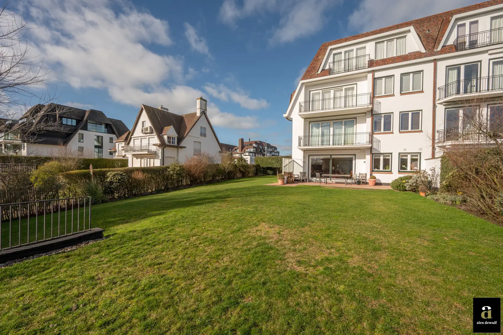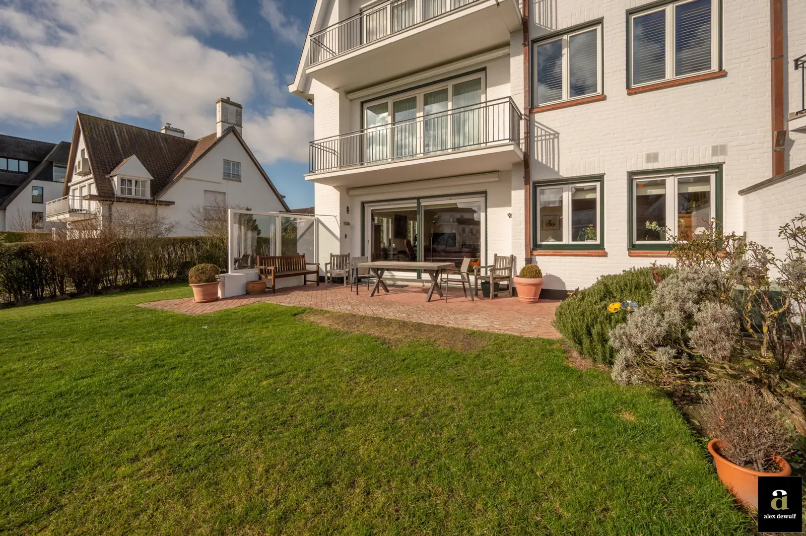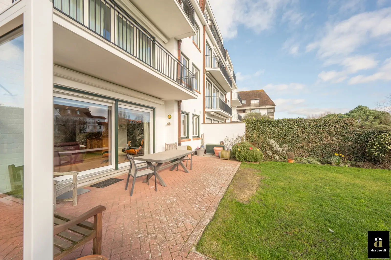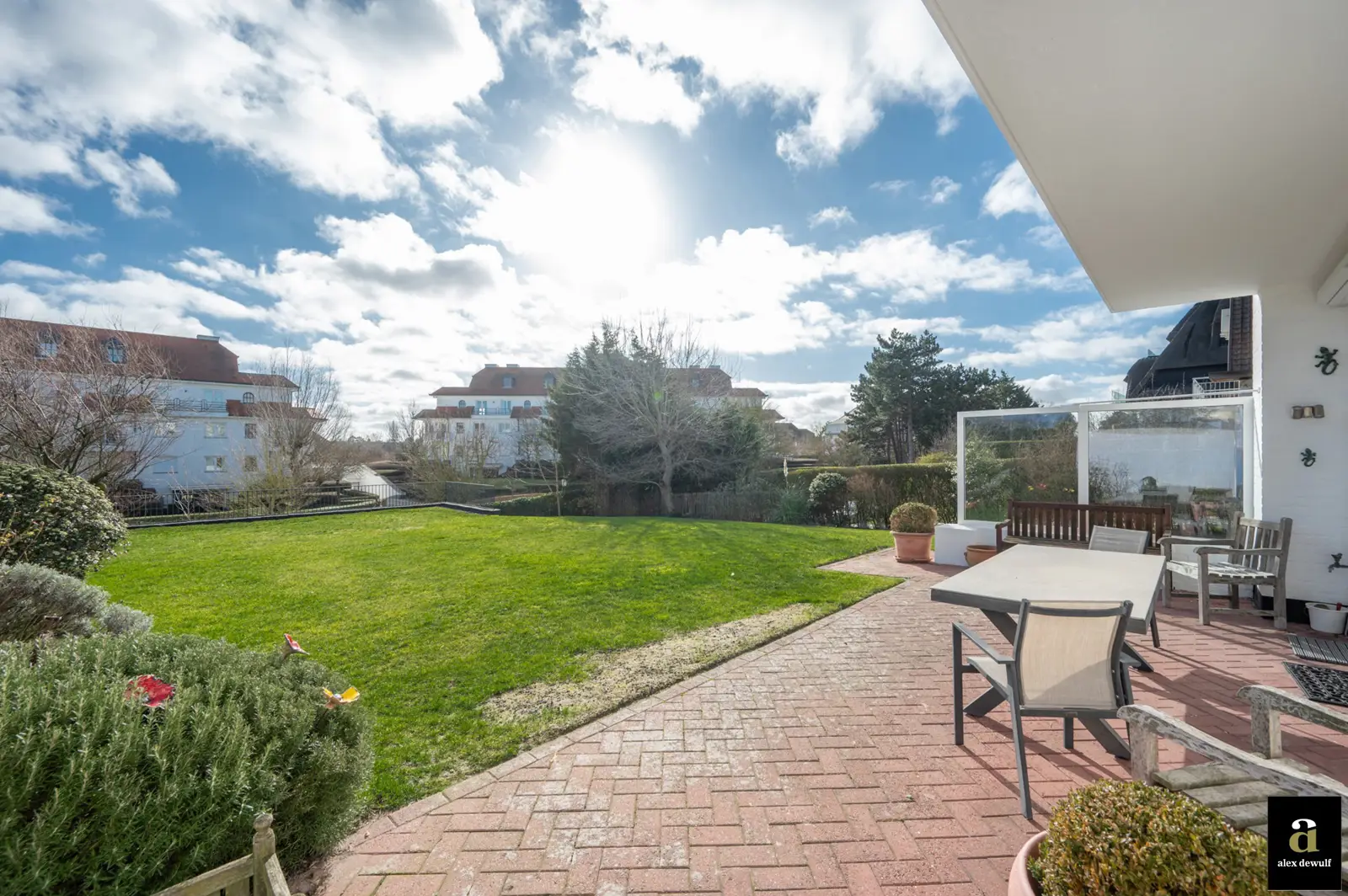 EXCLUSIEF TE KOOP: Zeldzaam hoek-tuinappartement, gelegen in een prestigieuze villaresidentie ter hoogte van de Wandeldijk, op slechts enkele stappen van het strand en de zee. Dit uitzonderlijke appartement beschikt over een privatieve tuin en ruim terras met een perfecte oriëntatie. Dankzij de hoekligging geniet u van een open, groen uitzicht en een sublieme lichtinval gedurende de hele dag. Indeling: Stijlvolle inkomhal met gastentoilet en vestiaire. De royale, lichtrijke leefruimte met gashaard sluit harmonieus aan op de open keuken, zithoek en eetplaats. Grote raampartijen bieden directe toegang tot het terras en de tuin, waar u in alle rust en privacy van de zon kunt genieten. De master bedroom beschikt over een en-suite badkamer met toilet en een dressing. Daarnaast zijn er twee volwaardige dubbele slaapkamers en een douchekamer. Het appartement is voorzien van elektrische rolluiken en beschikt over een ruime privatieve kelder en een fietsenberging. Er is tevens mogelijkheid tot aankoop van een dubbele staanplaats in de residentie. De gevel en de luiken van de residentie werden volledig herschilderd in 2025.