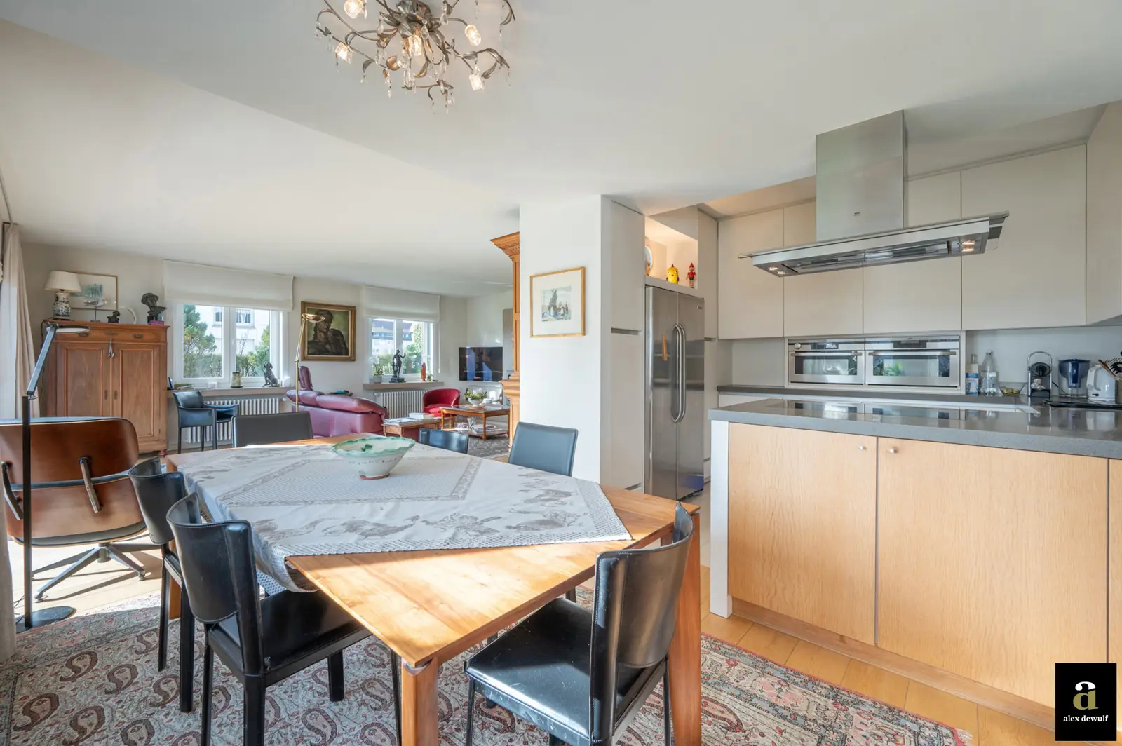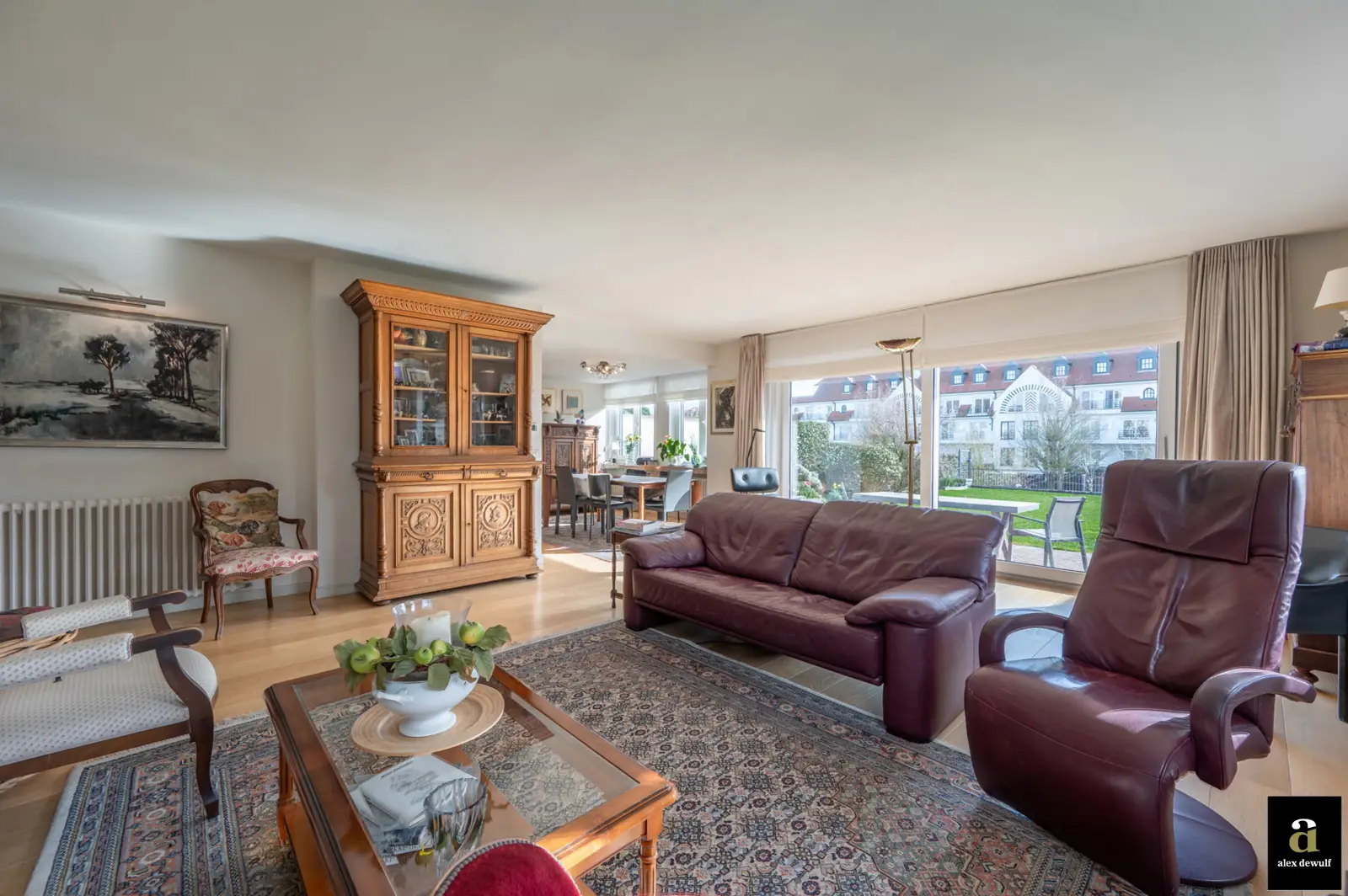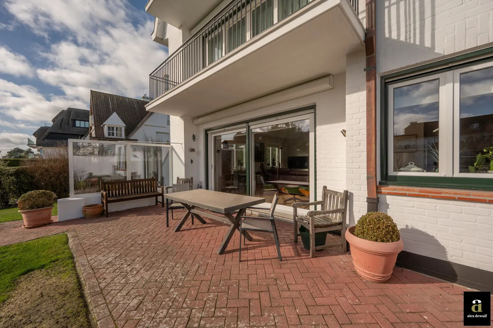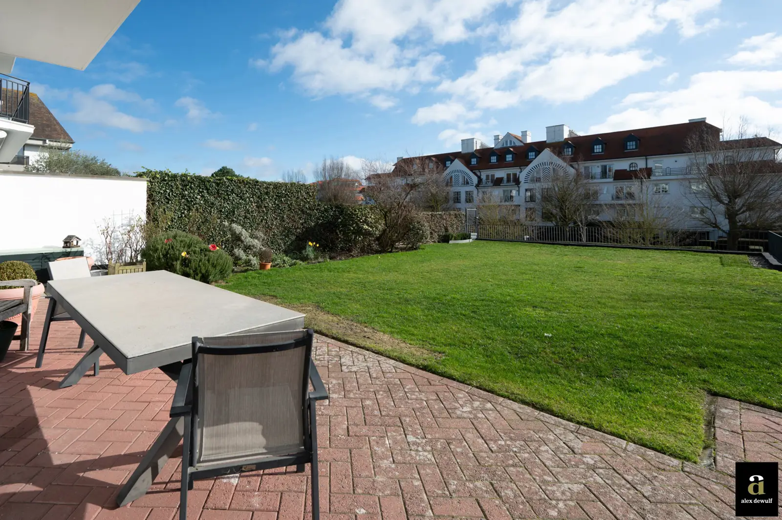 EXCLUSIEF TE KOOP: Zeldzaam hoek-tuinappartement, gelegen in een prestigieuze villaresidentie ter hoogte van de Wandeldijk, op slechts enkele stappen van het strand en de zee. Dit uitzonderlijke appartement beschikt over een privatieve tuin en ruim terras met een perfecte oriëntatie. Dankzij de hoekligging geniet u van een open, groen uitzicht en een sublieme lichtinval gedurende de hele dag. Indeling: Stijlvolle inkomhal met gastentoilet en vestiaire. De royale, lichtrijke leefruimte met gashaard sluit harmonieus aan op de open keuken, zithoek en eetplaats. Grote raampartijen bieden directe toegang tot het terras en de tuin, waar u in alle rust en privacy van de zon kunt genieten. De master bedroom beschikt over een en-suite badkamer met toilet en een dressing. Daarnaast zijn er twee volwaardige dubbele slaapkamers en een douchekamer. Het appartement is voorzien van elektrische rolluiken en beschikt over een ruime privatieve kelder en een fietsenberging. Er is tevens mogelijkheid tot aankoop van een dubbele staanplaats in de residentie. De gevel en de luiken van de residentie werden volledig herschilderd in 2025.