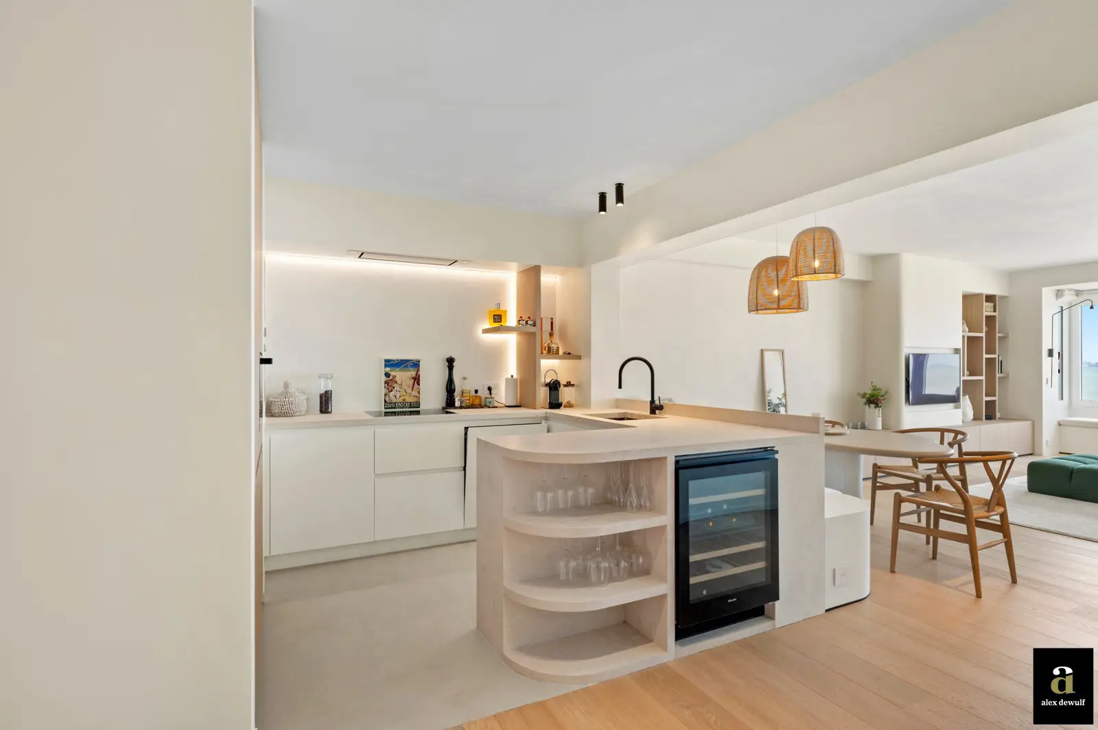 Prachtig vakantie appartement met 3 slaapkamers, volledig vernieuwd in de Zuiderse Ibiza-stijl, op een toplocatie te Zeedijk-Zoute. In de nabije omgeving vindt u allerlei goede restaurants, bistro's, alsook vele boetieks. Indeling: inkomhal met vestiaire, gastentoilet, praktische berging met aansluiting wasmachine en droogkast, moderne open keuken met kookeiland en voorzien van alle comfort (fineer eiken houten kasten met veel opbergruimte, wijnfrigo, quooker kraan, Miele ovens).Living met salon en eetplaats in parketvloer en met magnifiek uitzicht op zee !Via de nachthal bereiken we 3 volwaardige slaapkamers. Er zijn 2 grote slaapkamers met dubbele bedden en ingebouwde kleerkasten. Beide kamers hebben een eigen badkamer en geven uit op het terras achteraan. De master bedroom heeft haar eigen badkamer met een ligbad, inloopdouche in mortex en lavabomeubel, alsook ingebouwde extra kasten (dressing). De 2e kamer heeft ook haar ensuite ruime douchekamer.De derde slaapkamer (goed voor een enkel bed of stapelbed) heeft ook haar eigen douchekamer en een buitenraam. Airco voorzien in het appartement. Private berging op de benedenverdieping. Mogelijkheid tot huren van een goede garagebox onder het Albertplein. EPC : 174kWh/m² (UC: 3382728)
