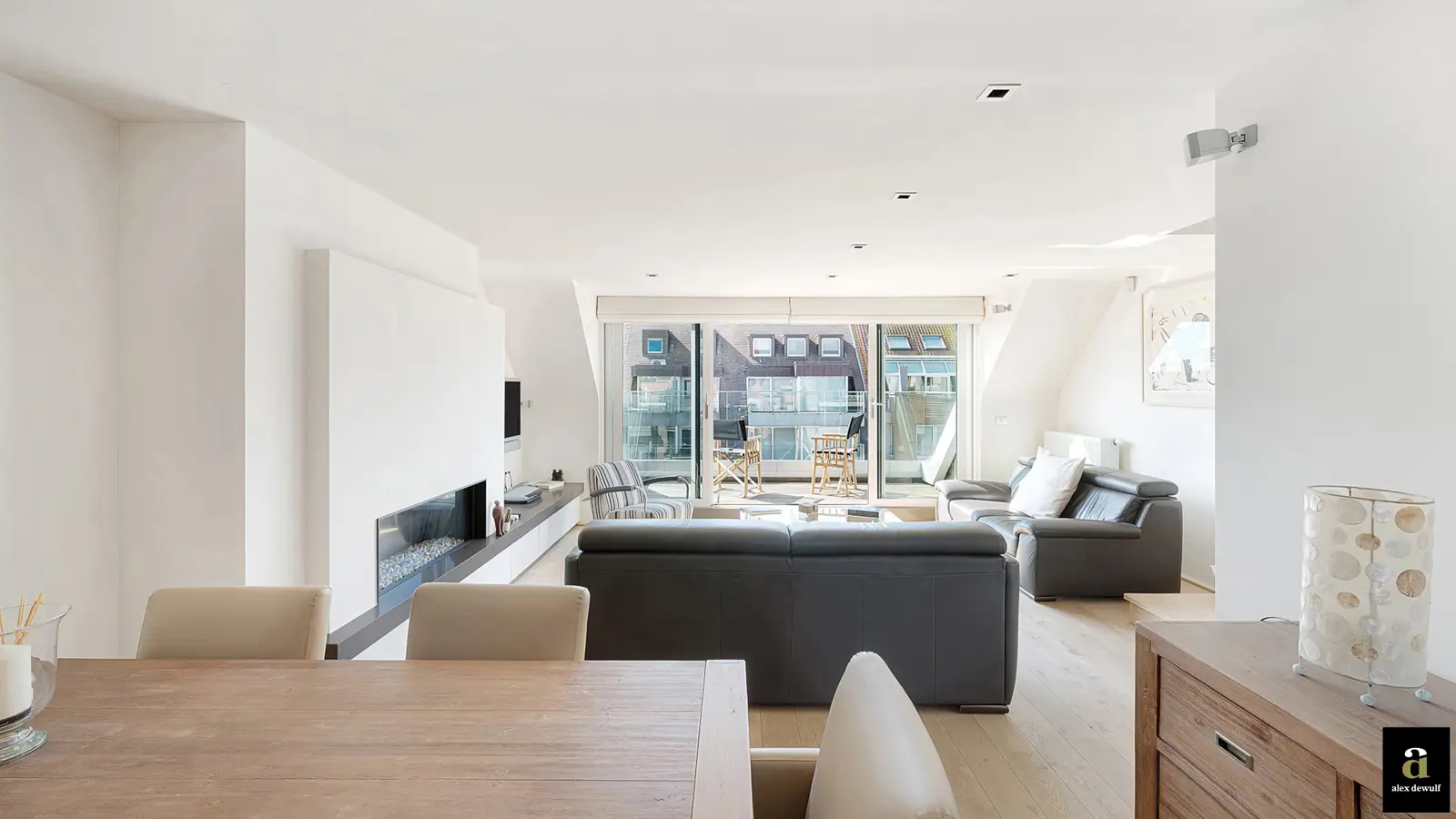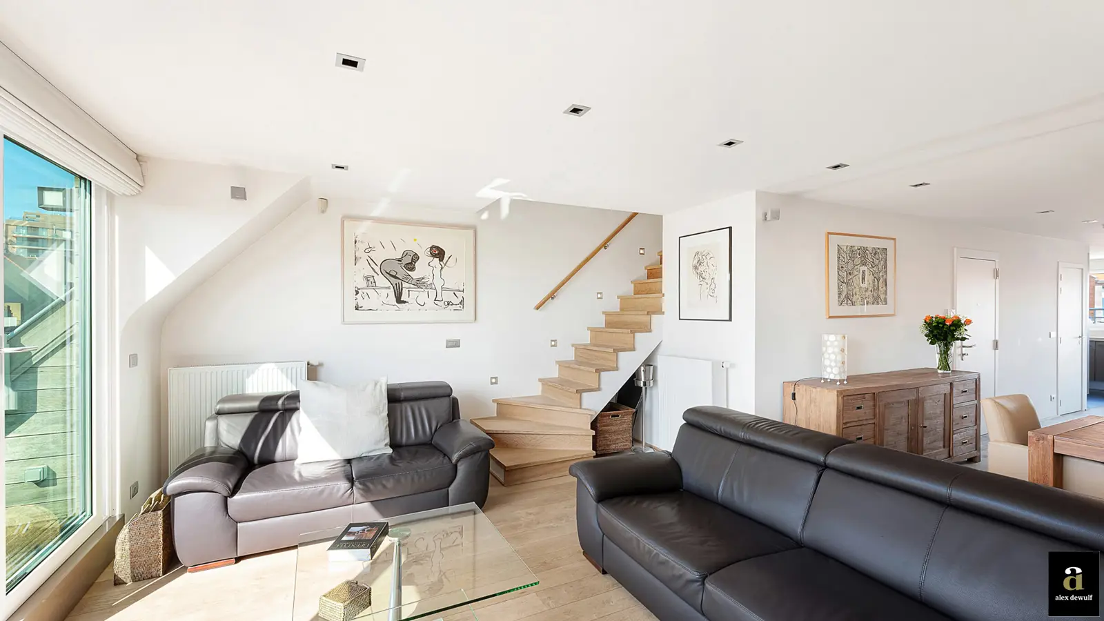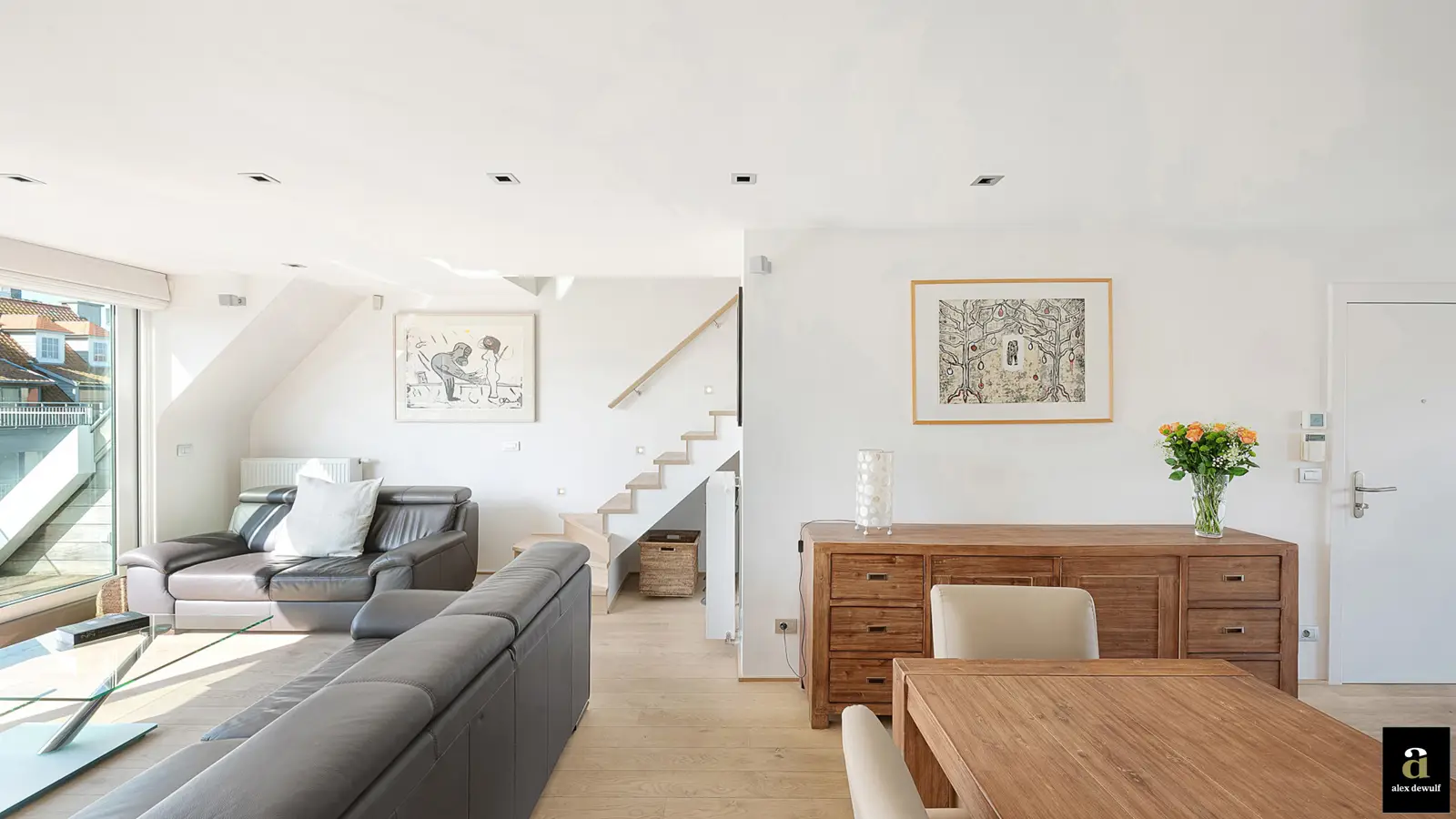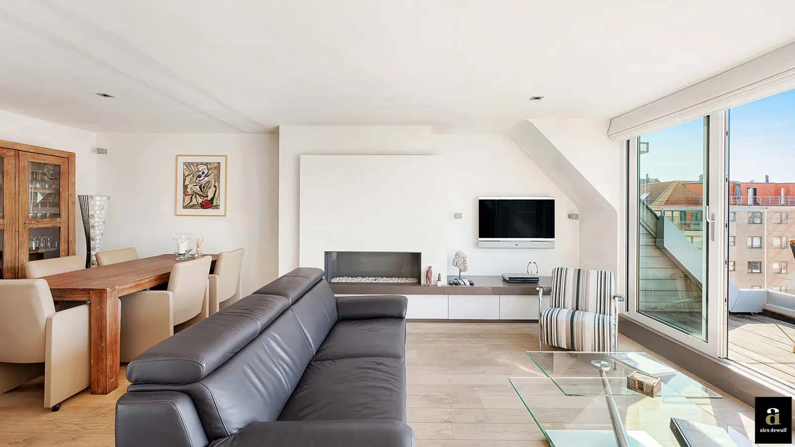Aangenaam en modern duplexappartement, gelegen op een leuke locatie op wandelafstand van het strand. De lichtrijke leefruimte met haard vormt het hart van het appartement en sluit mooi aan op de open, verzorgde keuken. Aansluitend bevindt zich een praktische berging. Zowel vooraan als achteraan geniet u van een terras, met vooraan een ruim zonneterras. Op de verdieping bevinden zich twee volwaardige slaapkamers, elk met een eigen badkamer, evenals een apart toilet. Daarnaast is er een derde ruimte die momenteel is ingericht als bureau, maar perfect kan dienen als extra slaapkamer met plaats voor een éénpersoonsbed. Verder beschikt het appartement over een privatieve berging, ruim genoeg voor het stallen van twee fietsen, en is er vuilnisophaling voorzien in de residentie. Een aangename duplex met een praktische indeling op een gegeerde ligging.
