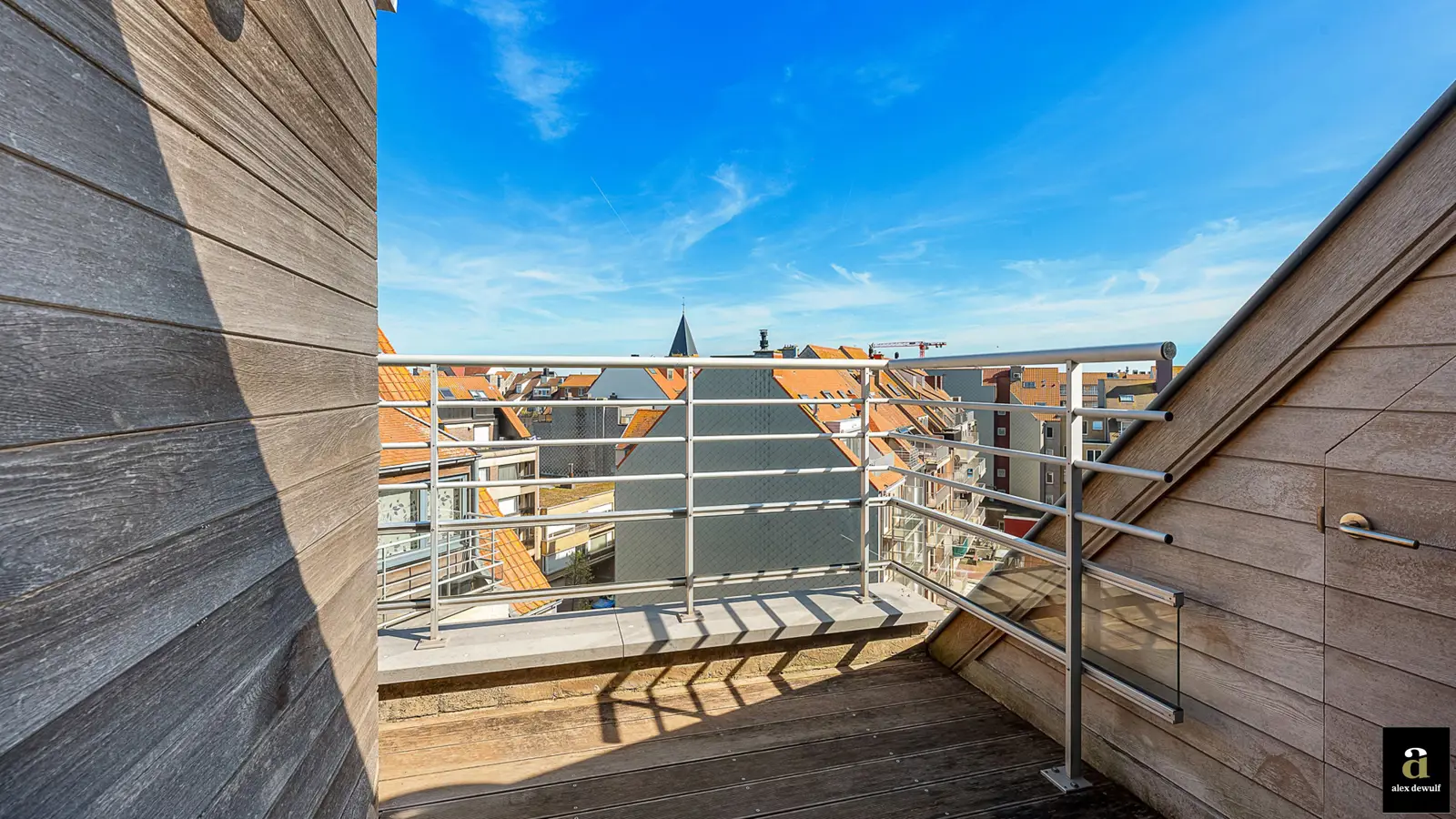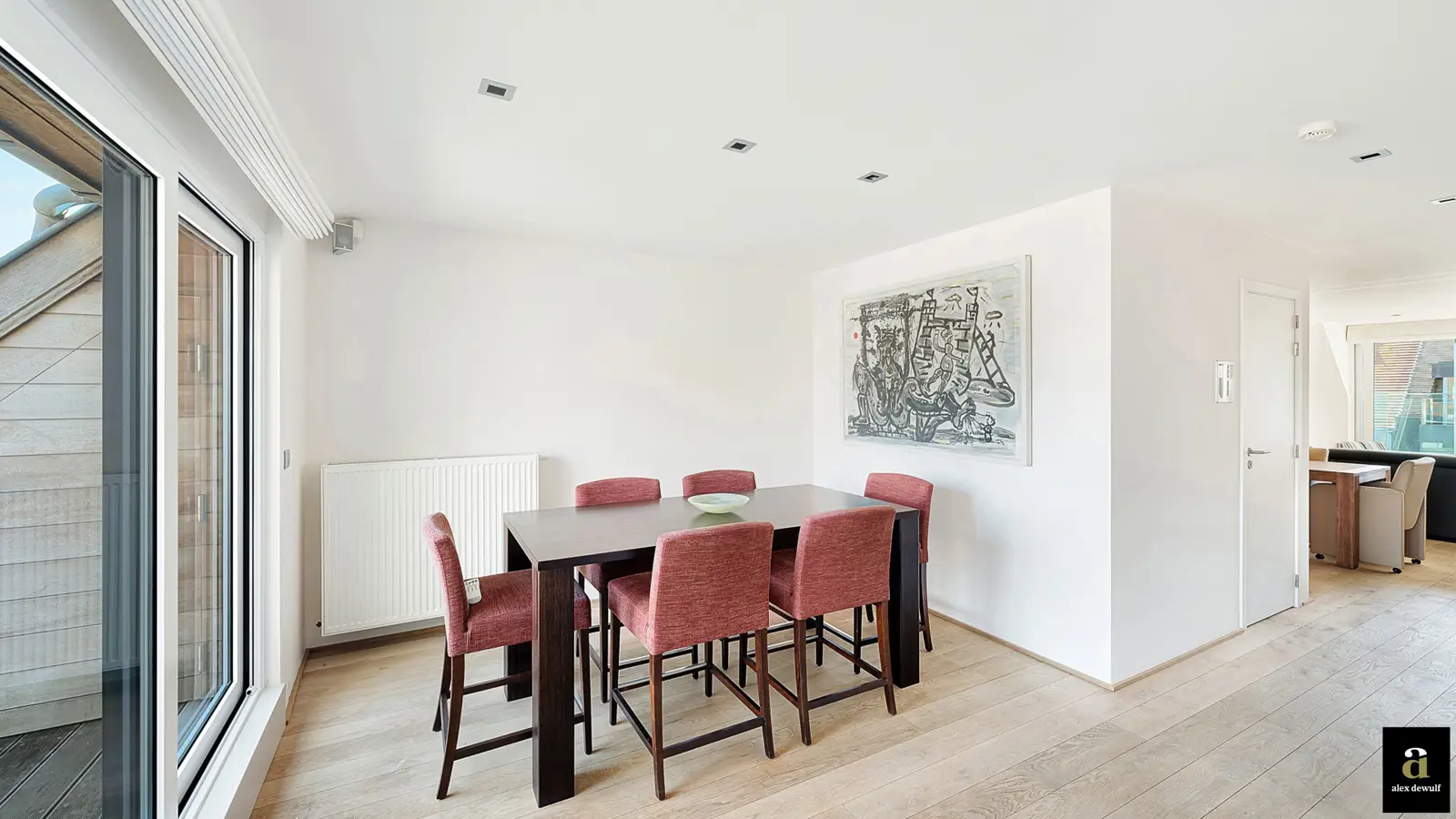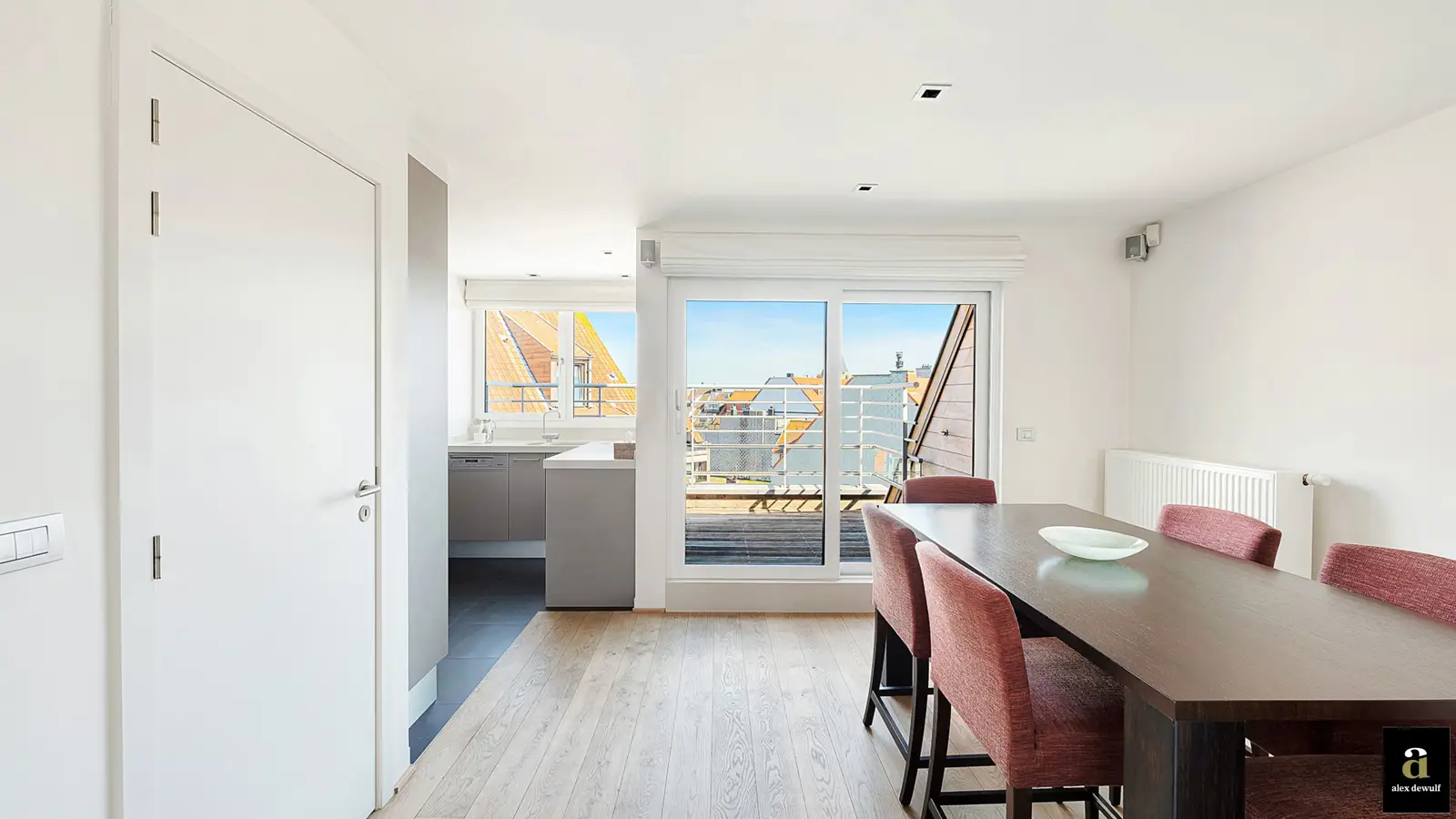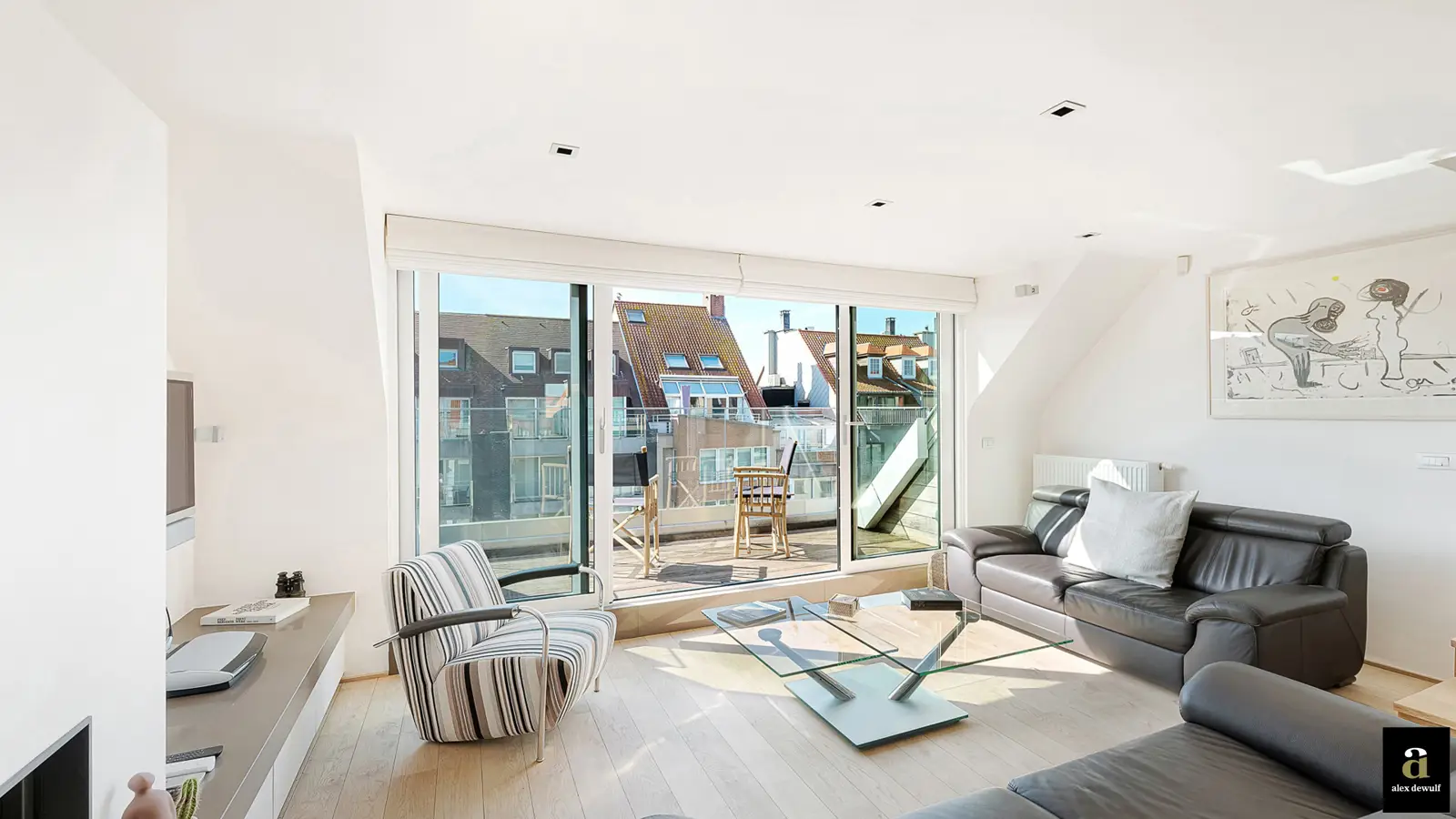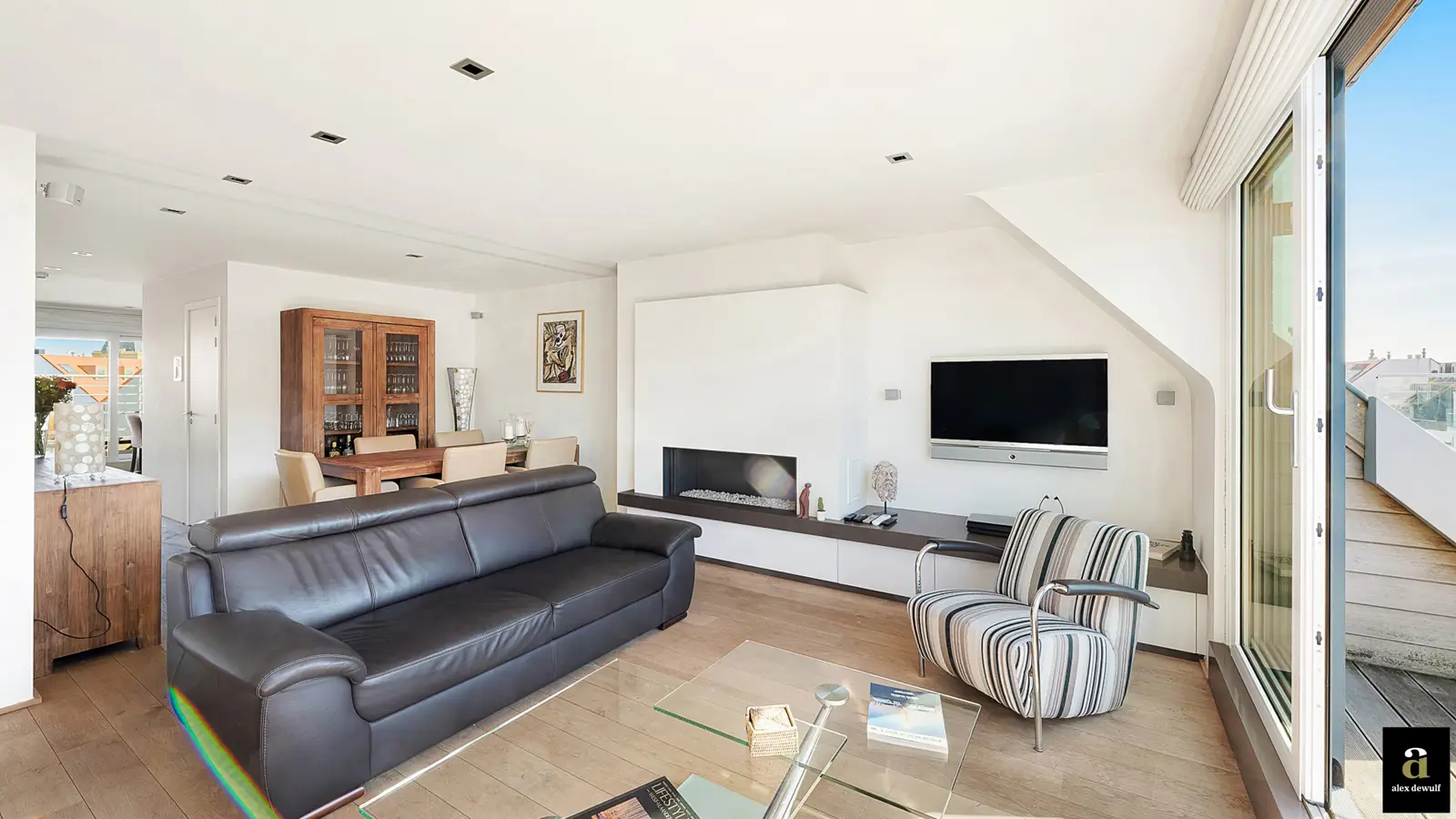 Aangenaam en modern duplexappartement, gelegen op een leuke locatie op wandelafstand van het strand. De lichtrijke leefruimte met haard vormt het hart van het appartement en sluit mooi aan op de open, verzorgde keuken. Aansluitend bevindt zich een praktische berging. Zowel vooraan als achteraan geniet u van een terras, met vooraan een ruim zonneterras. Op de verdieping bevinden zich twee volwaardige slaapkamers, elk met een eigen badkamer, evenals een apart toilet. Daarnaast is er een derde ruimte die momenteel is ingericht als bureau, maar perfect kan dienen als extra slaapkamer met plaats voor een éénpersoonsbed. Verder beschikt het appartement over een privatieve berging, ruim genoeg voor het stallen van twee fietsen, en is er vuilnisophaling voorzien in de residentie. Een aangename duplex met een praktische indeling op een gegeerde ligging.