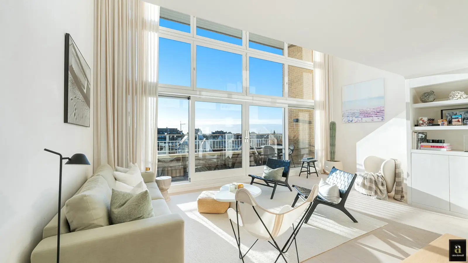 In Duinbergen, op enkele passen van de zeedijk en de RSBC, bevindt zich dit uitzonderlijk mezzanine-appartement van ca. 180 m² (7m gevelbreedte) in een mooi gebouw, Residentie Capri. Volledig zuidgericht en 4 grote slaapkamers, mogelijkheid tot aankoop van een goede garagebox in het gebouw. Indeling:Zesde verdieping: inkom, brede en lichtrijke leefruimte met grote raampartijen en toegang tot het brede zuidgerichte terras ( 2 meter breed) met open zicht over de villawijk, quasi geen inkijk, moderne open keuken voorzien van alle Miele toestellen. Achteraan op het leefniveau bevinden zich twee ruime slaapkamers uitgevend op een achterterras, een grote badkamer met inloopdouche en een dressing (welke ook kan dienst doen als voorraadkamer of extra berging). Gastentoilet apart. Op de boven verdieping (niv 7): een comfortabele zitruimte/televisiekamer op de mezzanine met zicht over de villa’s van Duinbergen, twee grote slaapkamers voor dubbele bedden. De master bedroom met en-suite douchekamer, een gastenkamer met plaats voor dubbel bed en een eigen douchekamer, een berging met aansluitingen voor wasmachine en droogkast. De verdieping is ook bereikbaar via de gemeenschappelijke lift.Dit appartement werd ingericht met hoogwaardige materialen en oog voor detail: maatkasten in elke kamer, inbouwspots, ingewerkte plinten, …Individuele nutsvoorzieningen (water, gas, elektriciteit), ventilatiesysteem type C, condenserende ketel en vloerverwarming in de leefruimtes.Bij het appartement hoort een privatieve kelder. Mogelijkheid tot aankoop van een ruime garagebox in het gebouw aan €100 000.