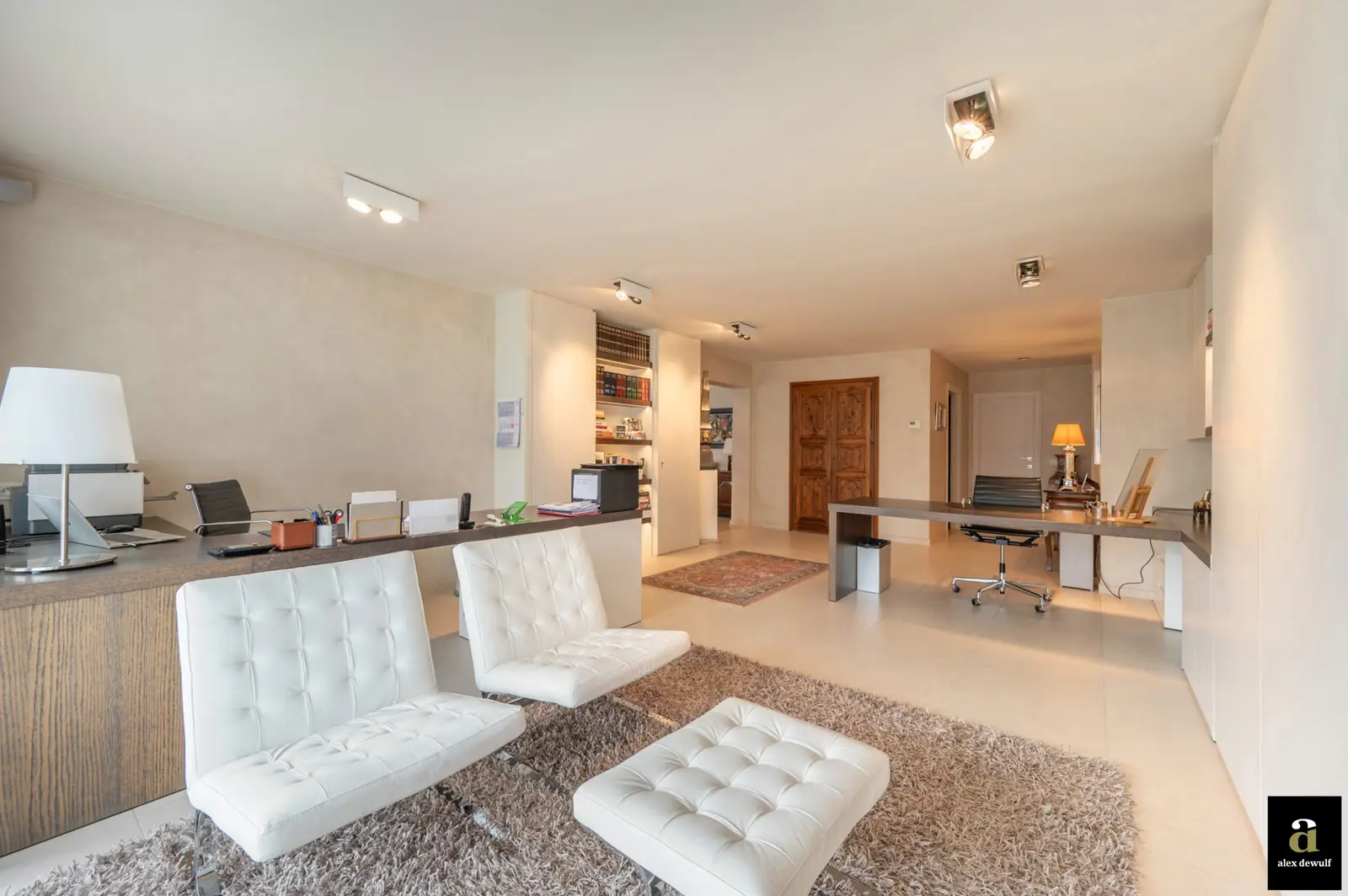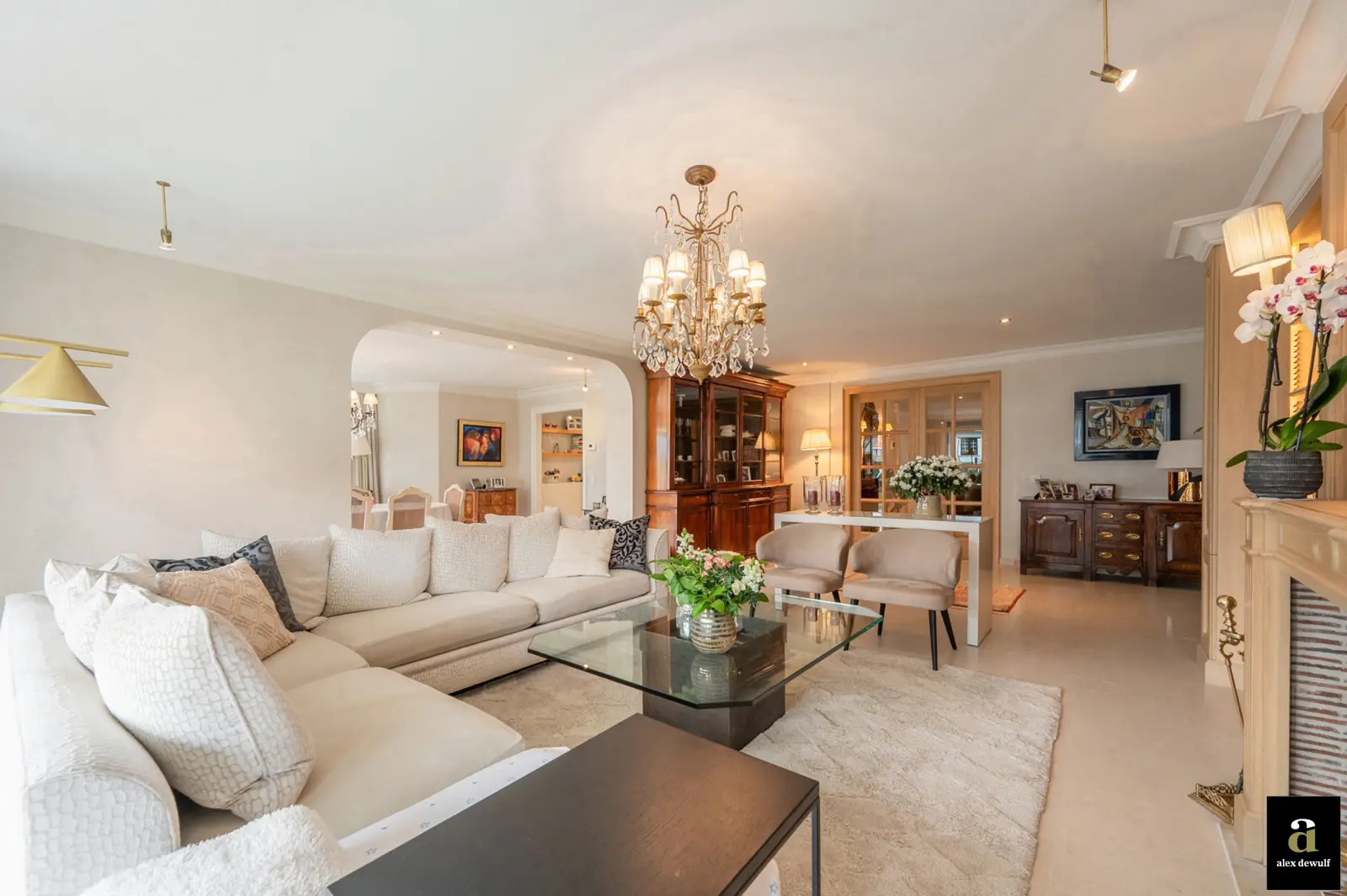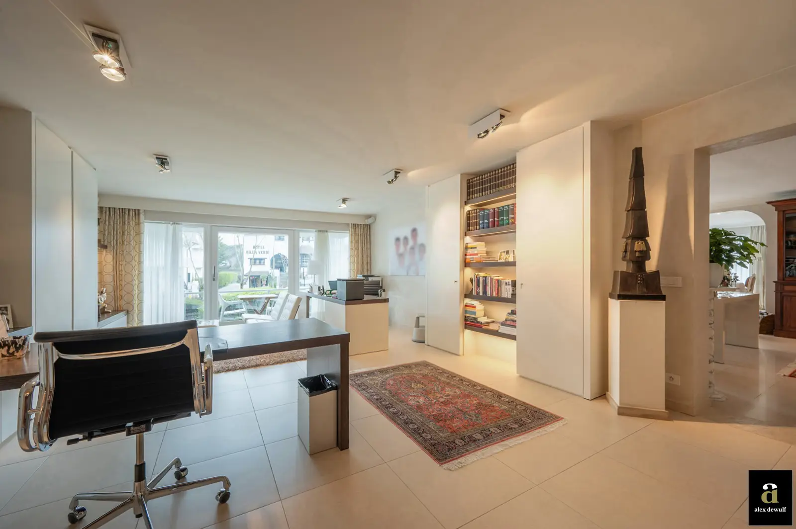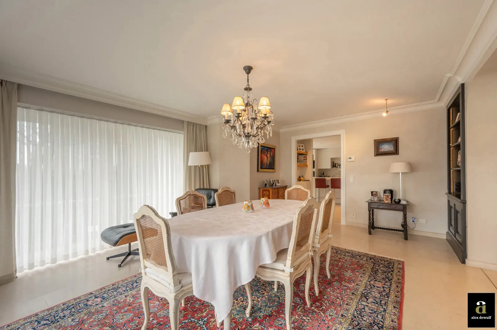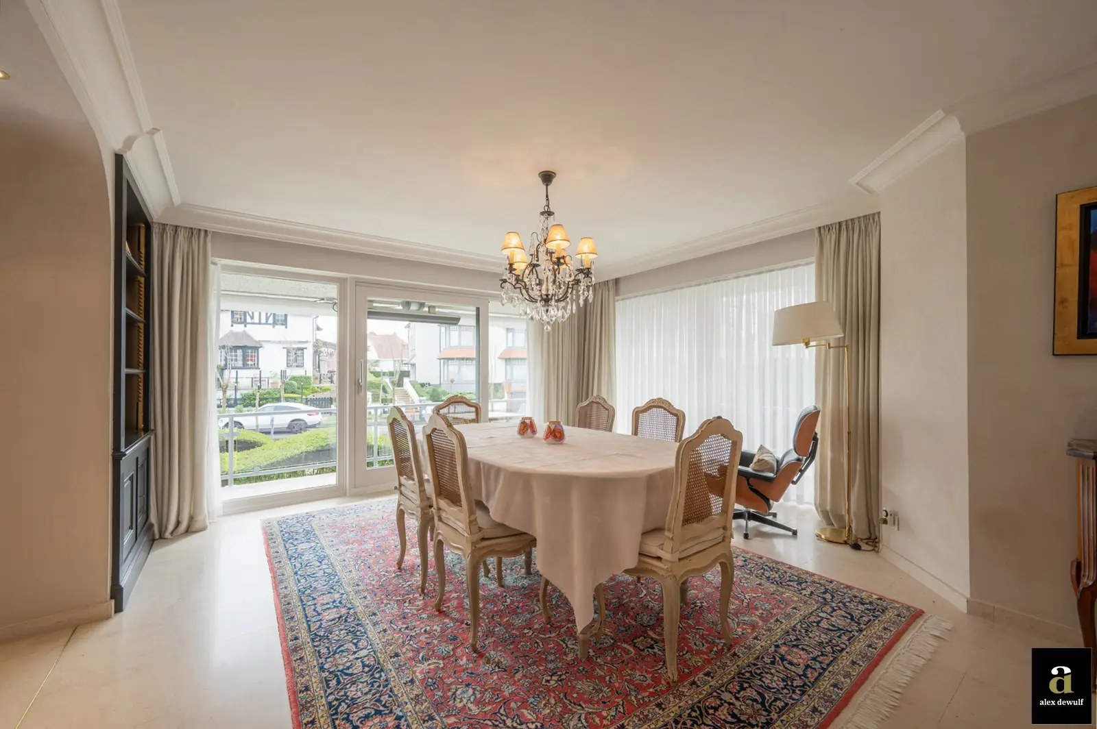 Een uitzonderlijk en exclusief appartement van ca. 300 m² met een brede gevel van 16 m en een prachtige privatieve tuin. Dit luxueuze tuinappartement met 4 slaapkamers bevindt zich in een stijlvolle villaresidentie gelegen op 25meter van het bekende Albertplein te Zoute, op slechts enkele stappen van de zee en het strand. Mogelijkheid tot aankoop van een dubbele garagebox inpandig.Bij het binnenkomen wordt u verwelkomd in een royale inkomhal met vestiaire en gastentoilet. De ruime, lichtrijke leefruimte bestaat uit een salon en een eetplaats die uitgeven op de zonnige terrassen. De volledig uitgeruste keuken, met aansluitende wasruimte en berging, biedt eveneens directe toegang tot het terras en de tuin. Verder is er een tweede salon of bureel aan de voorzijde, eveneens uitgevend op de terrassen met zicht naar het plein. De master bedroom beschikt over een volledige badkamer en een ruime dressing. Daarnaast zijn er nog drie volwaardige slaapkamers: een tweede slaapkamer (mogelijkheid tot douchekamer), een derde slaapkamer met aansluitende badkamer, en een vierde ruime slaapkamer met dressing en eigen badkamer, extra bergruimte en een toilet. Tweede wasruimte. Dubbele garagebox in de residentie. Een unieke opportuniteit voor wie op zoek is naar exclusief wonen in hartje Zoute, doch in alle rust en vlakbij zee.