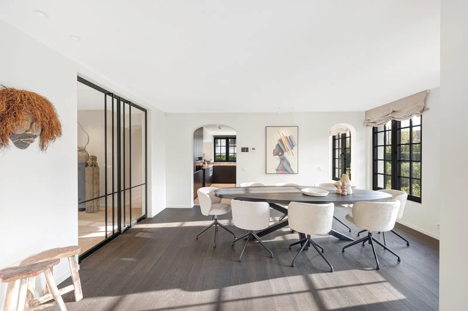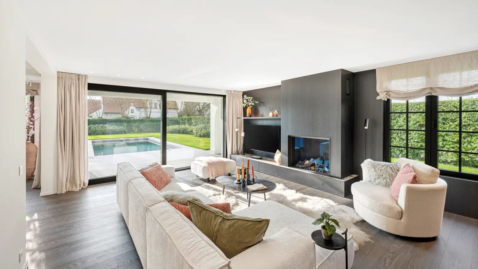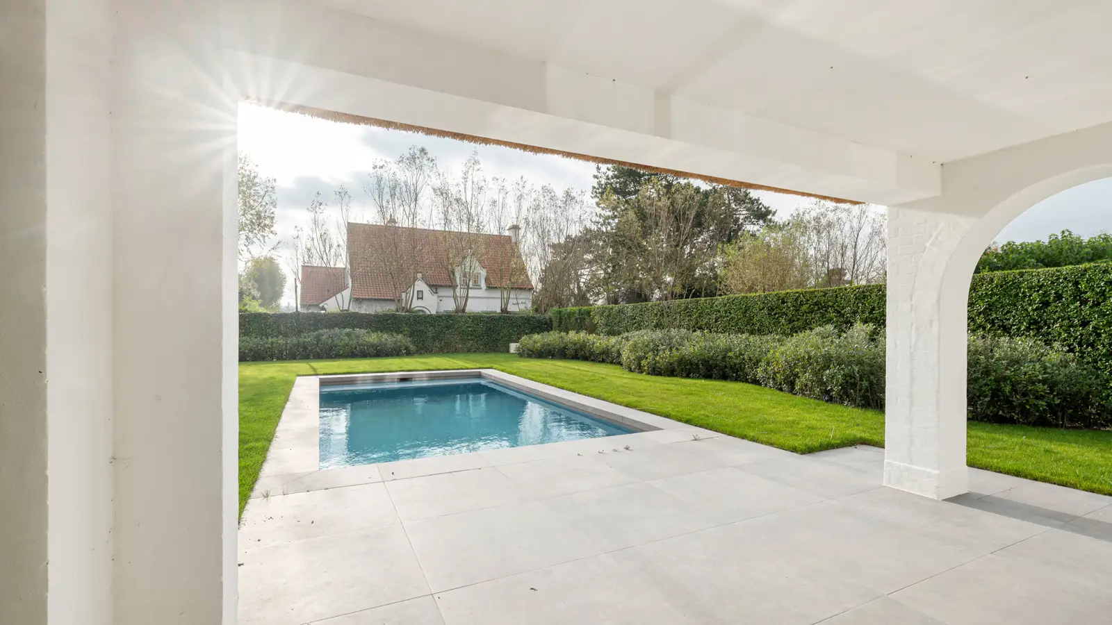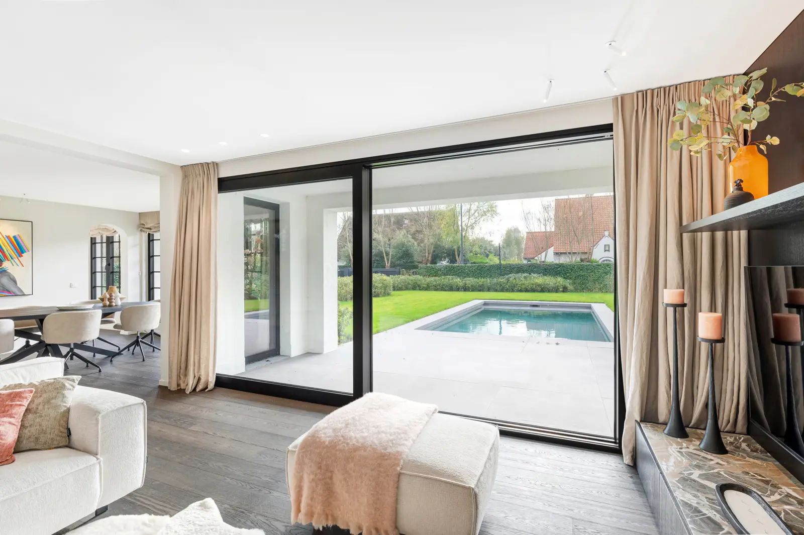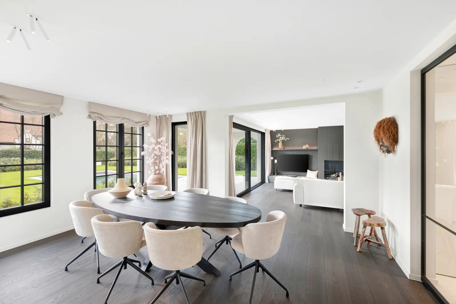 Zonnige, volledig vernieuwde villa met zwembad in het ZouteOp een absolute toplocatie in het residentiële Zoute, rustig gelegen in een doodlopende straat nabij de Kalfsmolen, bevindt zich deze luxueuze alleenstaande villa met zwembad. De woning is omgeven door groen en ligt op slechts vijf minuten rijden van het centrum van Knokke. Via het nabijgelegen Koningsbos wandelt u in alle rust naar het strand en de Kustlaan.De villa werd volledig gestript en met hoogwaardige materialen vernieuwd. Ze biedt een uitzonderlijk wooncomfort met onder meer 6 slaapkamers, 5 badkamers en een zuidgerichte tuin met verwarmd zwembad. Dankzij de automatische toegangspoort bereikt u de ruime oprit met plaats voor vier wagens. Er is ook een inpandige garage.Indeling: inkomhal met vestiaire en gastentoilet, ruime leefruimte in parket met open haard en maatwerkkasten in fineer eik, aparte eetruimte met toegang tot het overdekte terras en de tuin. De moderne keuken is volledig uitgerust met Miele-toestellen en een marmeren werkblad. Praktische wasruimte met extra bergruimte.Op de eerste verdieping bevinden zich vier volwaardige slaapkamers, elk met ingebouwde kasten en een eigen badkamer of douchekamer. De tweede verdieping telt nog twee ruime slaapkamers, een douchekamer en een apart toilet op de nachthal.EPC: 198 kWh/m² (UC: 3014336-RES-1)
